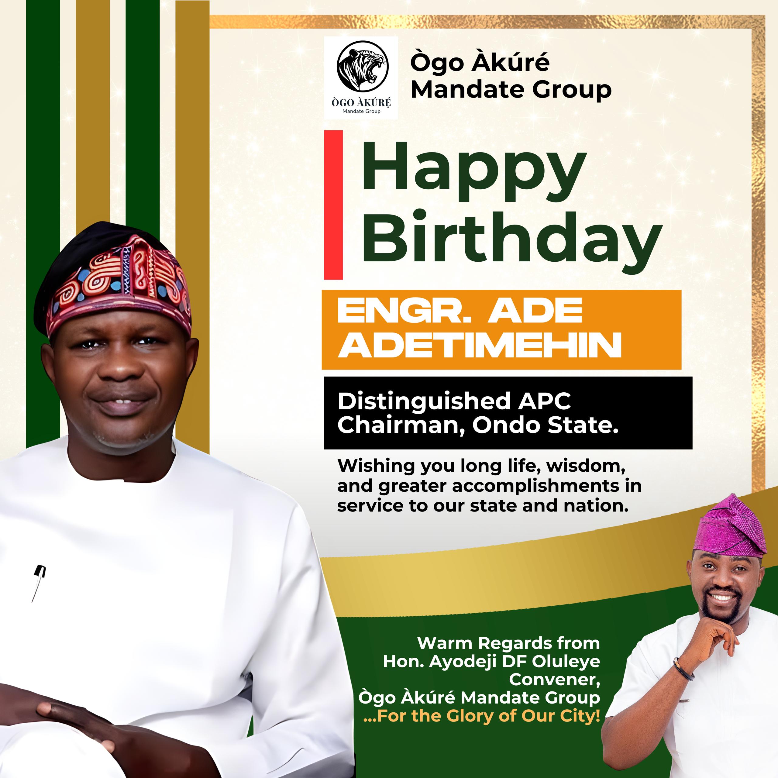 The Convener of the Ògo Àkúré Mandate Group, Comrade Ayodeji DF Oluleye, has extended warm felicitations to the Chairman of the All Progressives Congress (APC) in Ondo State, Engr. Ade Adetimehin, on the occasion of his birthday.