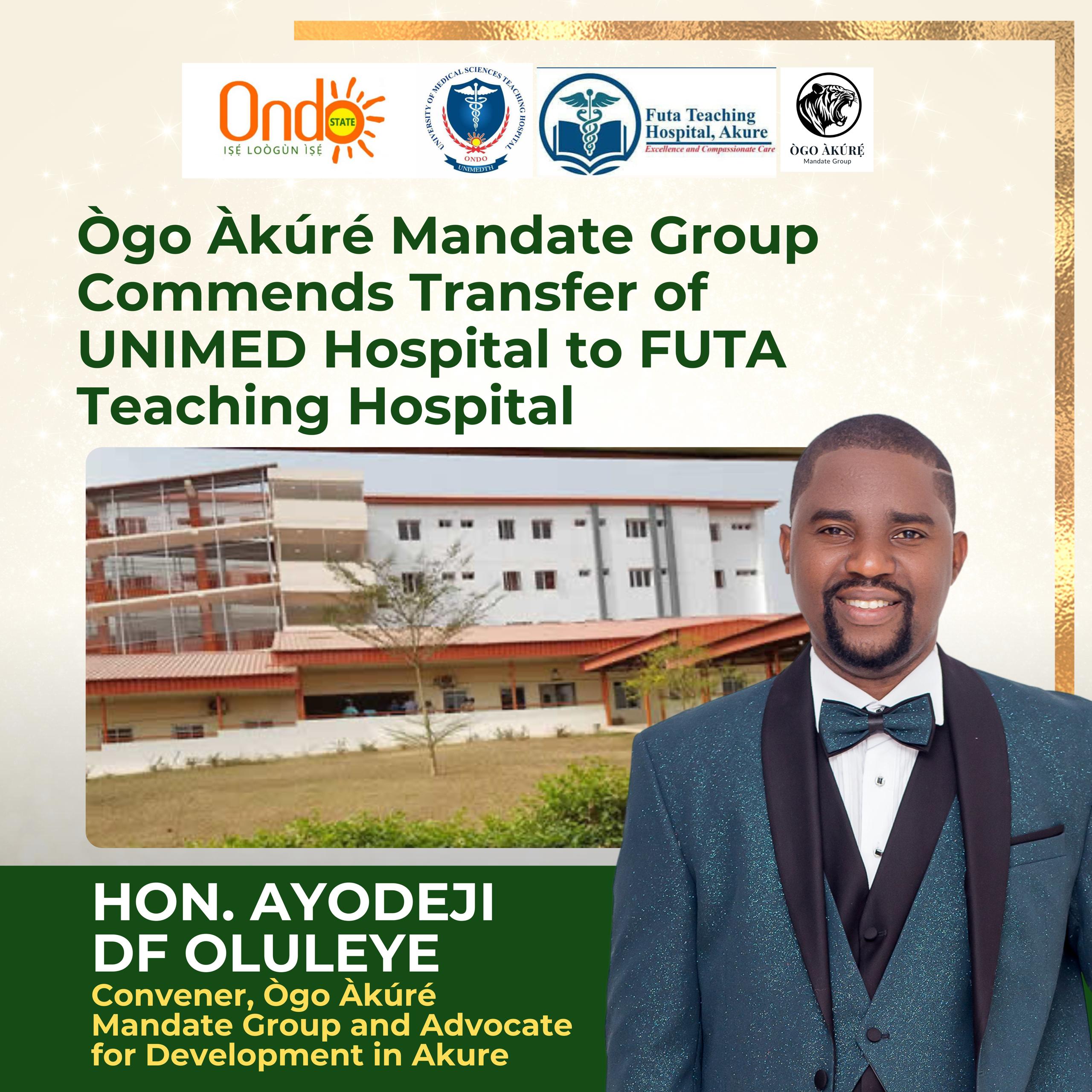 The Ògo Àkúré Mandate Group (ÒAMG), under the leadership of its Convener, Hon. Ayodeji DF. Oluleye, has applauded the recent approval to transfer the University of Medical Sciences Teaching Hospital (UNIMEDTH), Akure complex, to the Federal University of Technology, Akure (FUTA), to serve as its College of Medicine and Teaching Hospital.