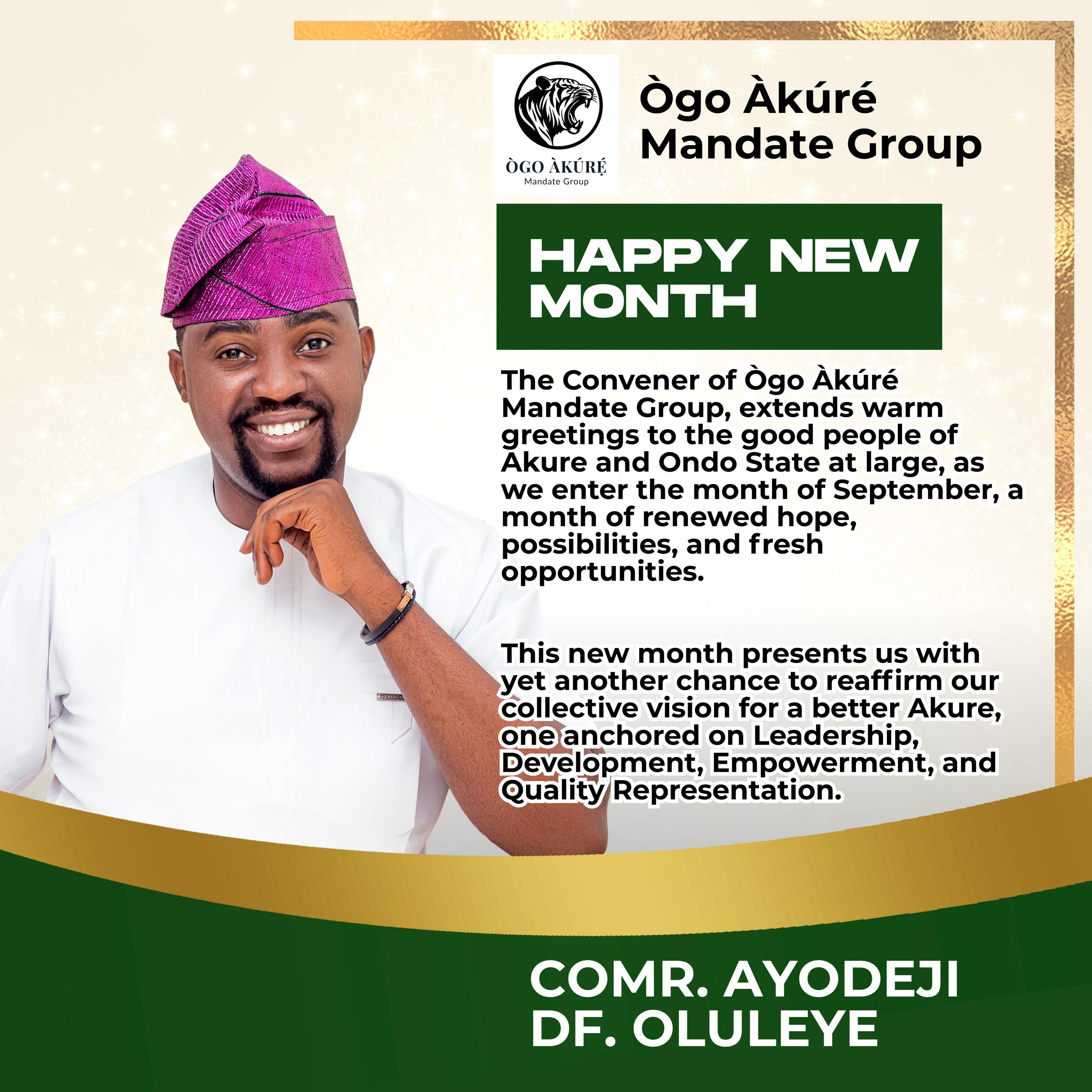 The Convener of Ògo Àkúré Mandate Group, Comrade Ayodeji DF Oluleye, extends warm greetings to the good people of Akure South and Akure North Federal Constituency, Ondo State, as we enter the month of September, a month of renewed hope, possibilities, and fresh opportunities.